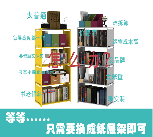 WAFF公司需要訂購一系列展架促銷展示他們的書本,但是他們面臨的問題是普通的鐵書架結構簡單,難運輸,成本高,品牌不凸顯,并且不借助小書架或其他文件夾的話,書本也不能很整齊的擺放........